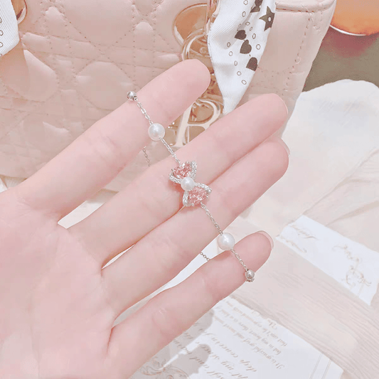 Pink Crystal Bowknot Pearl Chain Bracelet