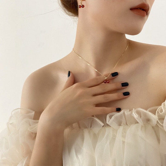 18K Gold Crystal Cherry Pendant Necklace Earrings Set