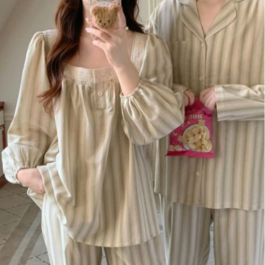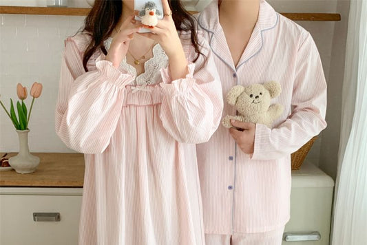 Couple Matching Long-Sleeve Striped Button Pajama Top / Pants / Square Neck Midi Sleep Dress / Set (Various Designs)
