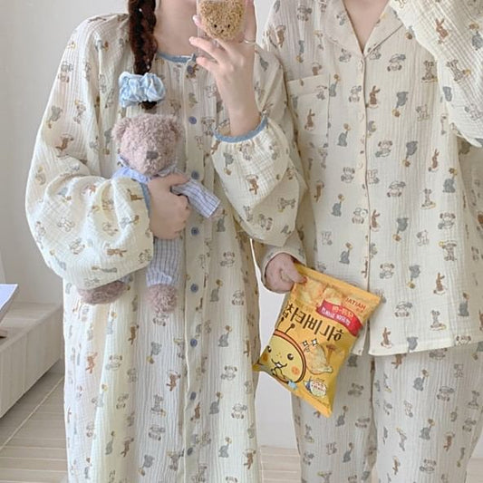 Couple Matching Long-Sleeve Cartoon Print Button-Up Midi Pajama Dress / Top / Pants / Set