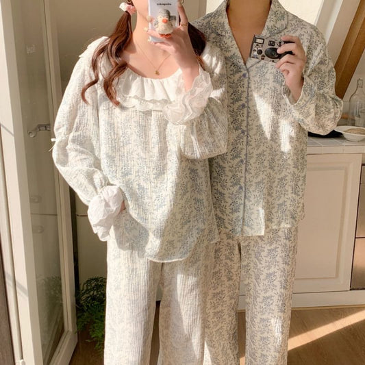Couple Matching Long-Sleeve Scoop Floral Print Midi Pajama Dress / Lapel Collar Button-Up Top / Pants / Set (Various Designs)