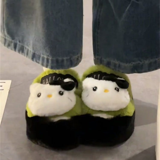 Cartoon Green Kitty Fuzzy Slippers KI642