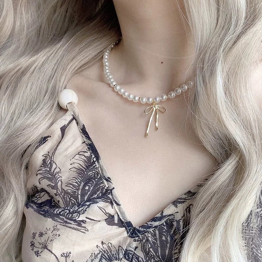 Elegant Gold Silver Plated Bowknot Pendant Pearl Chain Necklace