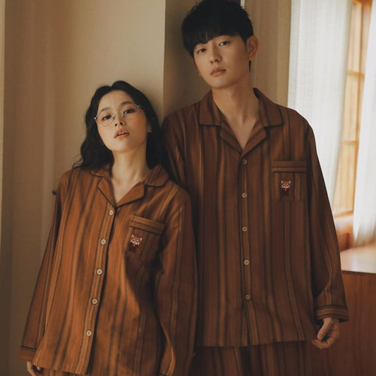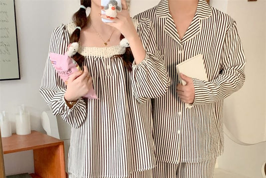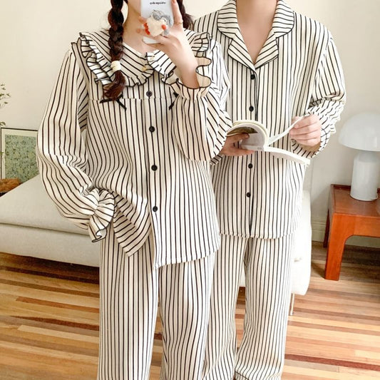 Couple Matching Pajama Set: Long-Sleeve Striped Button-Up Top + Pants (Various Designs)