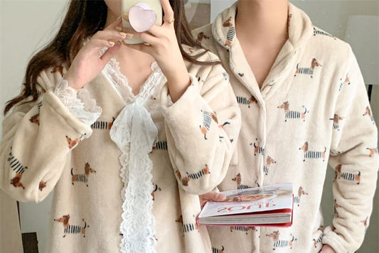 Couple Matching Pajama Set: Long-Sleeve Dog Print Button-Up Flannel Shirt + Pants