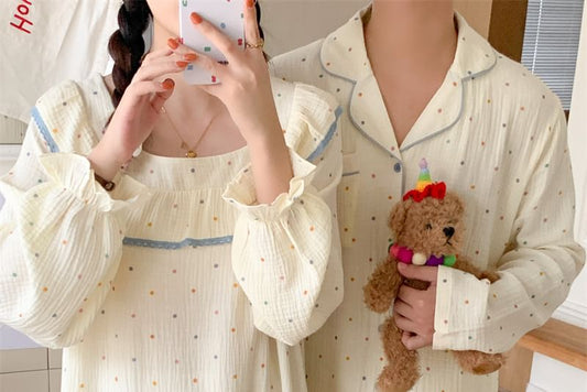 Couple Matching Long-Sleeve Dotted Pajama Top / Dress / Set