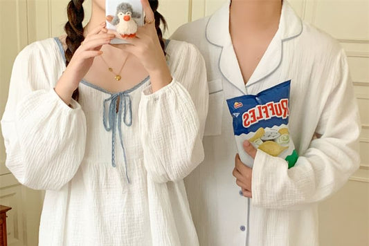 Couple Matching Long-Sleeve Contrast Trim Pajama Top / Pants / Midi Sleep Dress / Set (Various Designs)