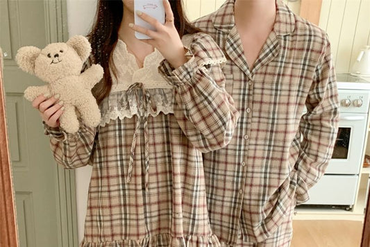 Couple Matching Long-Sleeve Notch Neck Plaid Lace Panel Pajama Top / Lapel Collar Button-Up Top / Pants / Set (Various Designs)