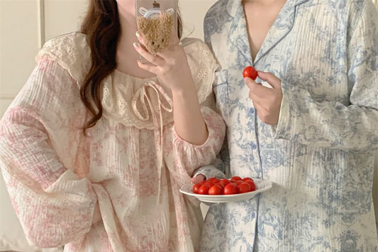 Couple Matching Long Sleeve Scoop Neck Patterned Print Ruffle Pajama Blouse / Collared Shirt / Straight Leg Pants / Pajama Dress / Set (Various Designs)