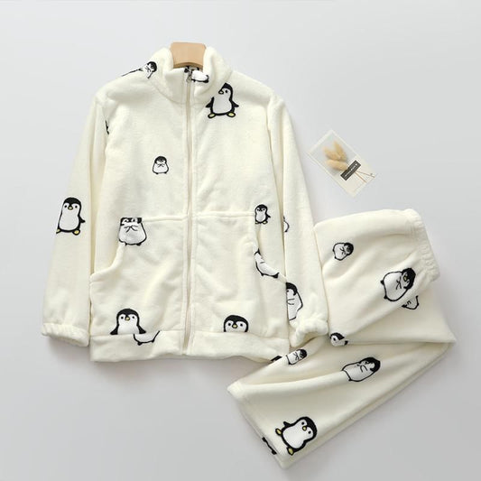 Couple Matching Pajama Set: Long-Sleeve Penguin Print Top + Pants (Various Designs)