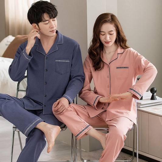 Couple Matching Pajama Set: Long-Sleeve Lapel Collar Contrast Trim Shirt + Pants