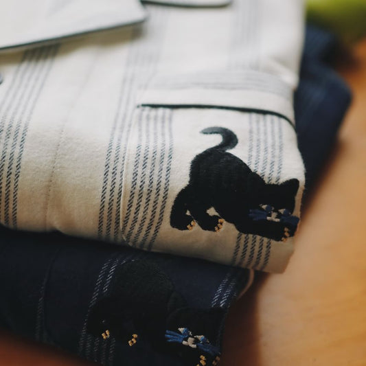 Couple Matching Pajama Set: Long Sleeve Collared Jacquard Shirt + Elastic Waist Straight Leg Pants (Various Designs)