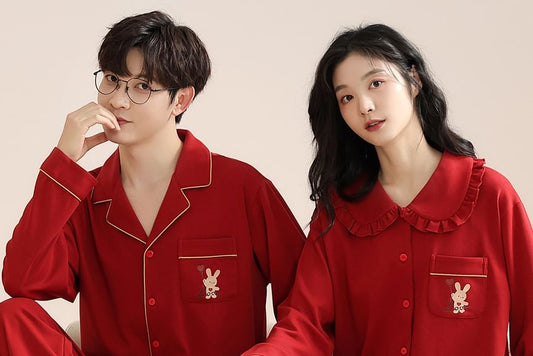 Couple Matching Pajama Set: Long Sleeve Collared Shirt + Elastic Waist Straight Leg Pants (Various Designs)