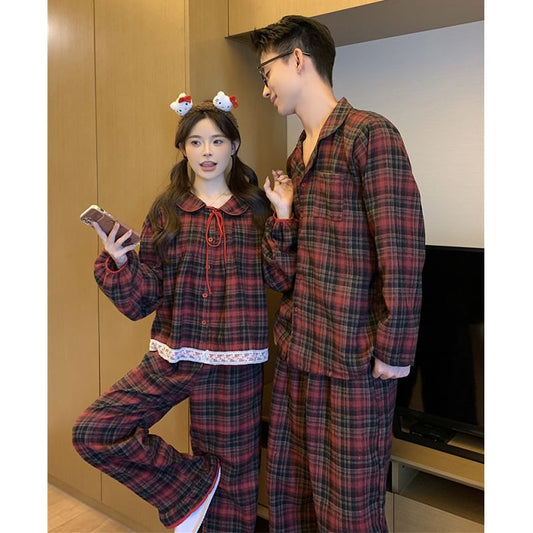 Couple Matching Long-Sleeve Plaid Pajama Shirt / Pants / Lace Trim Bow Shirt / Set