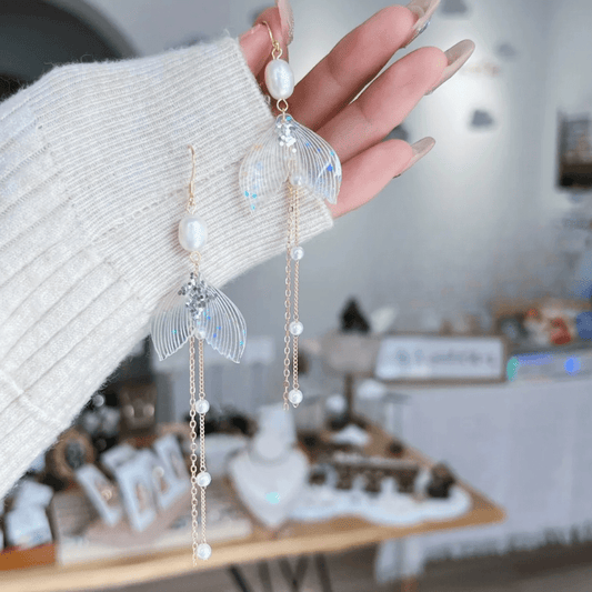 Goldfarbene Ohrclips mit Meerjungfrauenschwanz und Perlenkette und Quaste