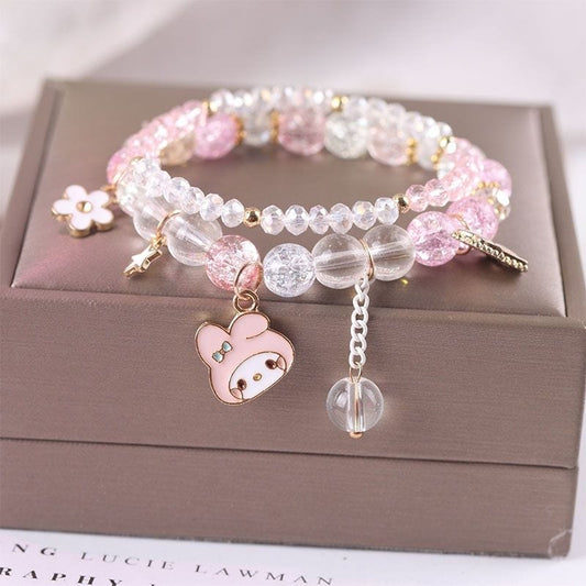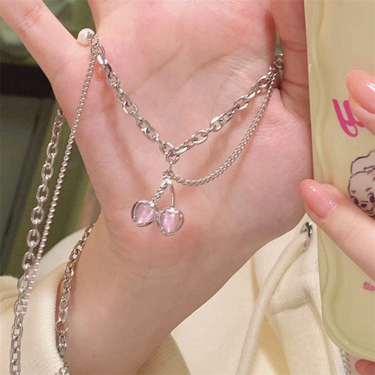Mehrreihige Halskette mit Perlenanhänger und rosa Kirsche