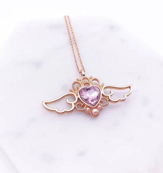 Perlenkette mit Engelsflügeln und Kristallen in Herzform