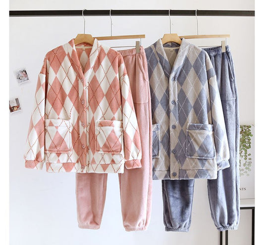 Couple Matching Pajama Set: Long-Sleeve V-Neck Argyle Flannel Button Top + Pants (Various Designs)
