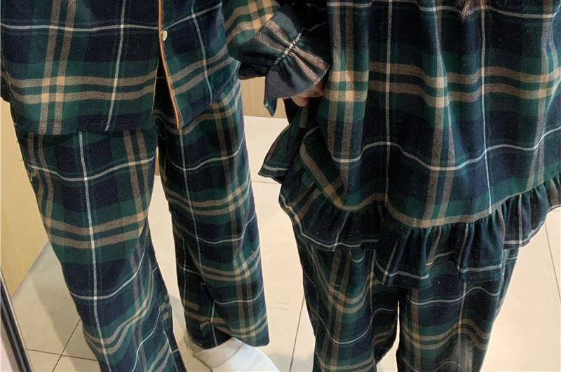 Couple Matching Long Sleeve Collared Plaid Pajama Shirt / V-Neck Bow Ruffle Panel Blouse / Straight Leg Pants / Set (Various Designs)