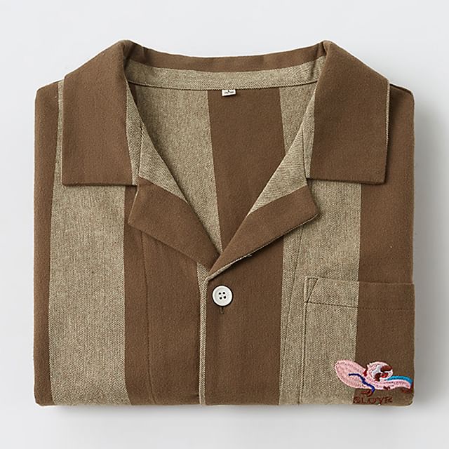 Couple Matching Pajama Set: Long-Sleeve Lapel Collar Striped Embroidered Button-Up Top + Pants (Various Designs)