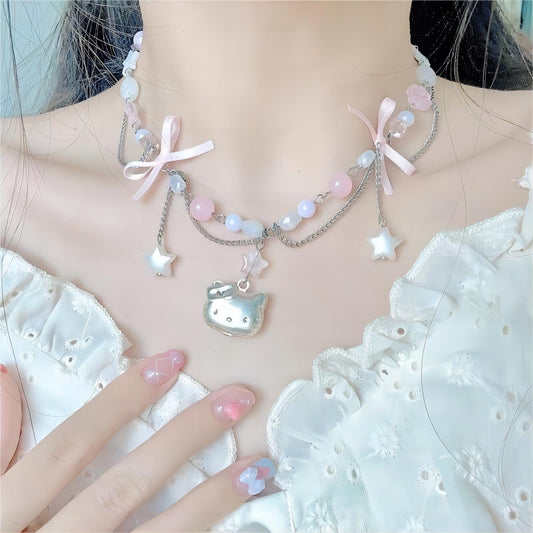 Collier chaîne à billes Kawaii à plusieurs couches avec motif de chaton étoilé