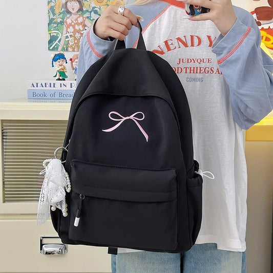 Bow Embroidered Nylon Laptop Backpack With Bag Charm