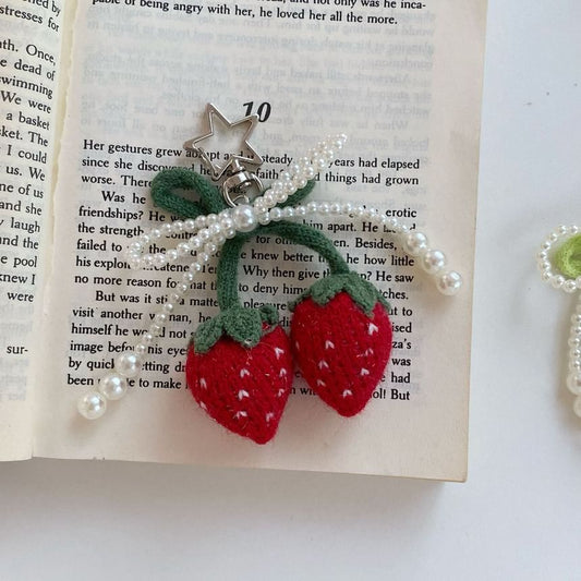Strawberry Knit Bow Faux Pearl Bag Charm Keyring