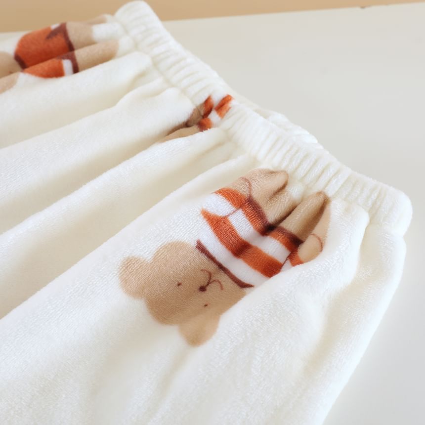 Couple Matching Pajama Set: Long Sleeve Collared Bear Patterned Button Coral Fleece Top + Elastic Waist Straight Leg Pants (Various Designs)
