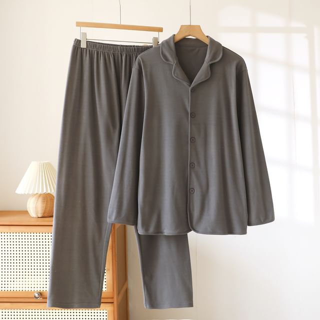 Couple Matching Pajama Set: Long-Sleeve Lapel Collar Button-Up Plain Top + Pants (Various Designs)