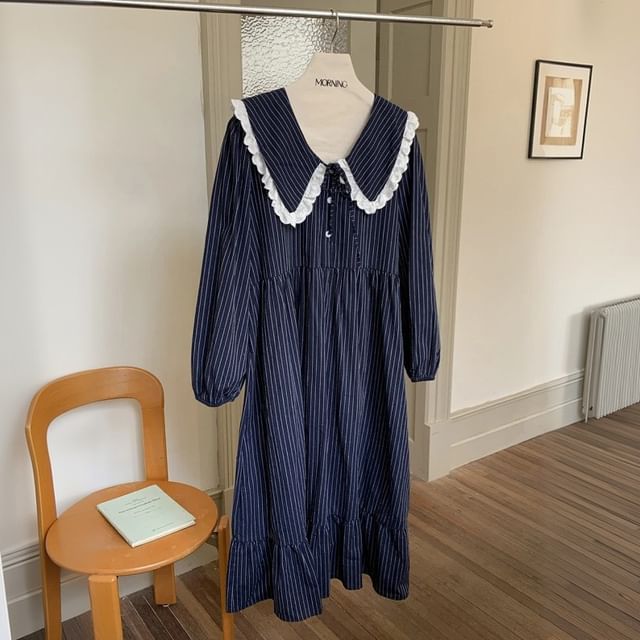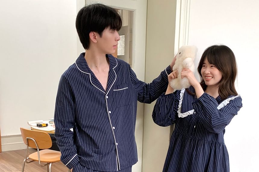 Couple Matching Long Sleeve Collared Pinstriped Ruffle Pajama Dress / Long Sleeve Shirt / Mid Rise Straight Leg Pants / Set