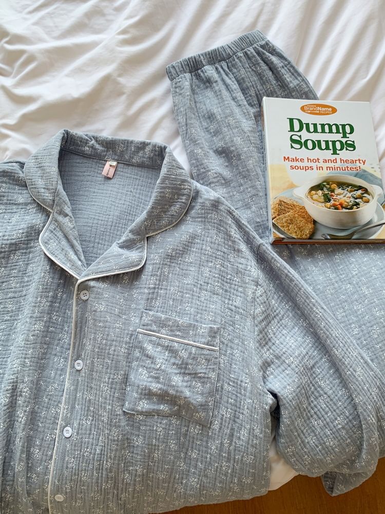 Couple Matching Long Sleeve V-Neck Floral Print Bow Pajama Dress / Long Sleeve Collared Shirt / Mid Rise Straight Leg Pants / Set