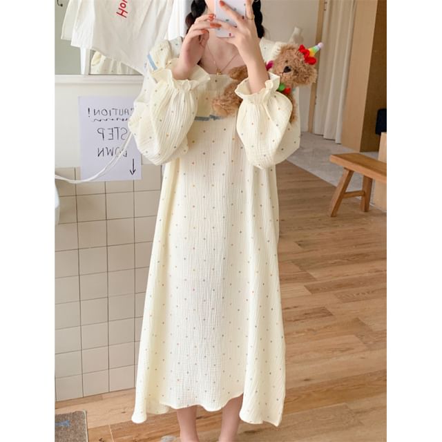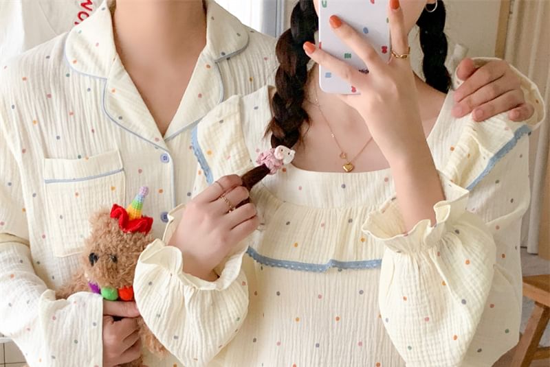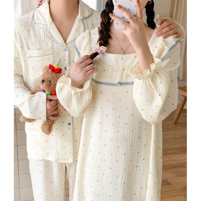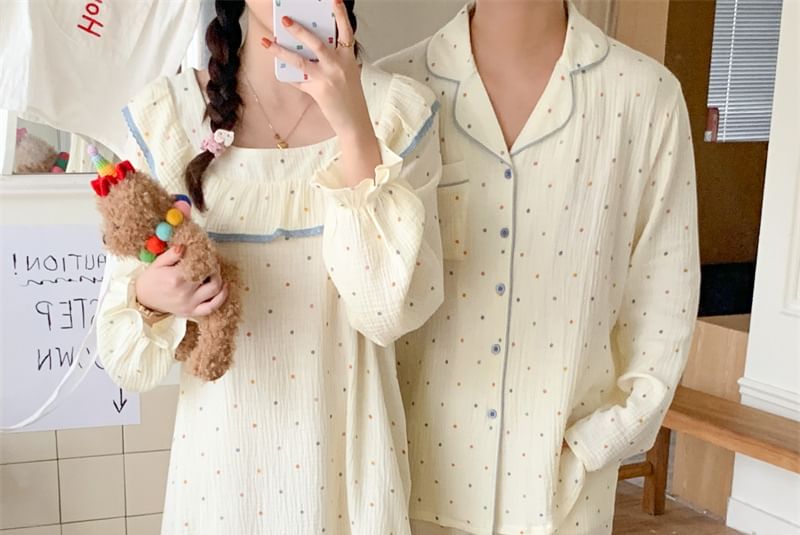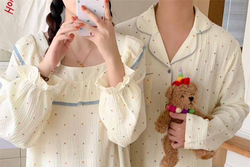 Couple Matching Long-Sleeve Dotted Button Pajama Top / Pants / Square Neck Midi Sleep Dress / Set
