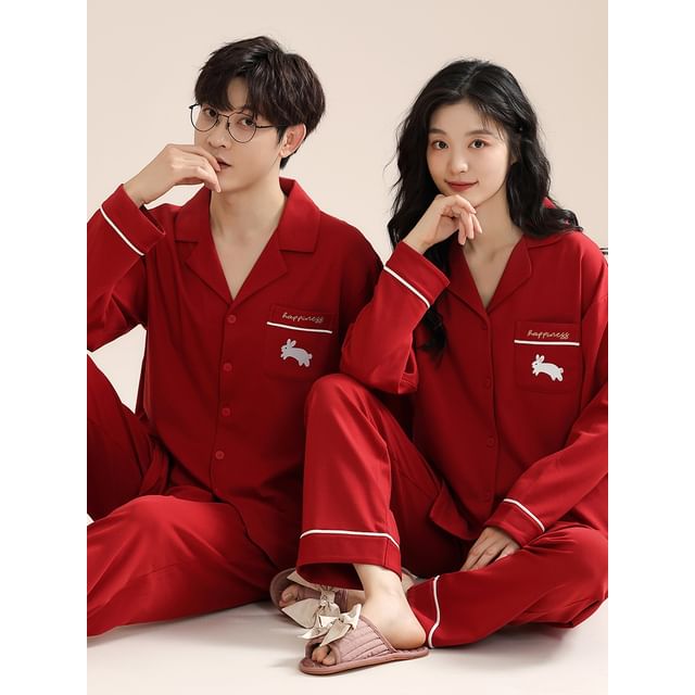 Couple Matching Pajama Set: Long Sleeve Collared Rabbit Print Shirt + Elastic Waist Straight Leg Pants (Various Designs)