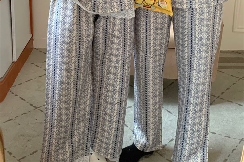 Couple Matching Pajama Set: Long-Sleeve Floral Print Button-Up Shirt + Pants