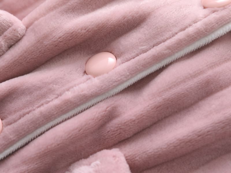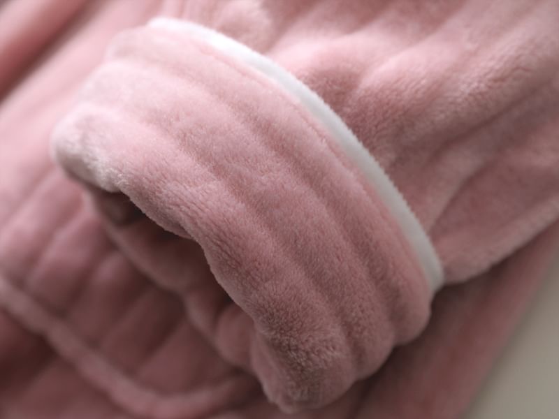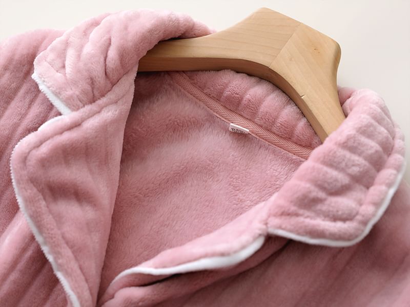 Couple Matching Pajama Set: Long-Sleeve Lapel Collar Contrast Trim Button-Up Fleece Top + Pants (Various Designs)