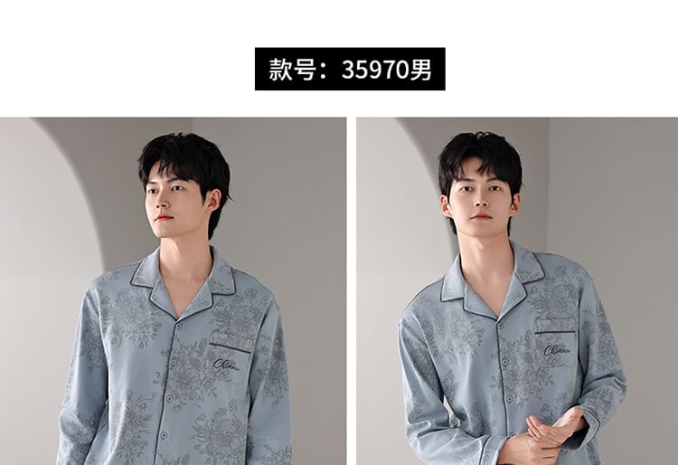 Couple Matching Pajama Set: Long-Sleeve Lapel Collar Floral Shirt + Pants